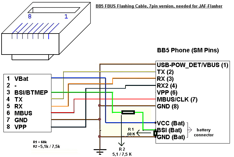2. Pinout BSI/BTEMP pada kabel flasher JAF/UFS terkoneksi dengan BSI pada mesin HP dengan melalui hambatan R senilai 5.1 K/7.5 K… BSI ke Ground 68K
